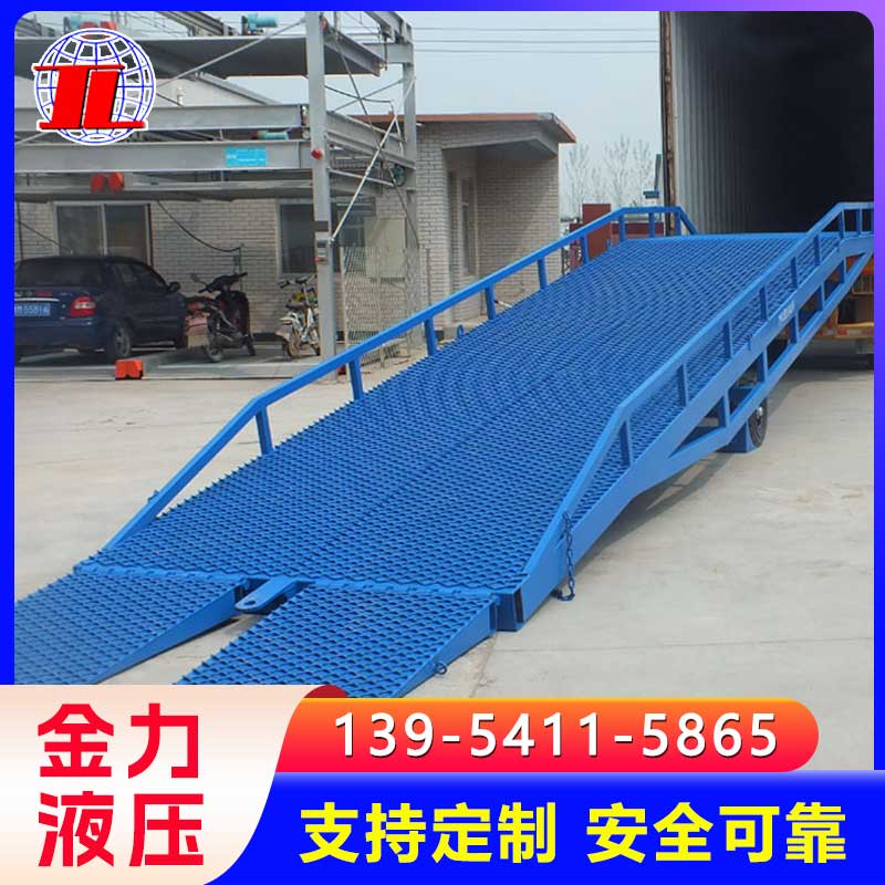 移动登车桥是与叉车配合使用的货物装卸辅助设备,可根据货车车厢不同高度调节,实现货物的快速装卸。
